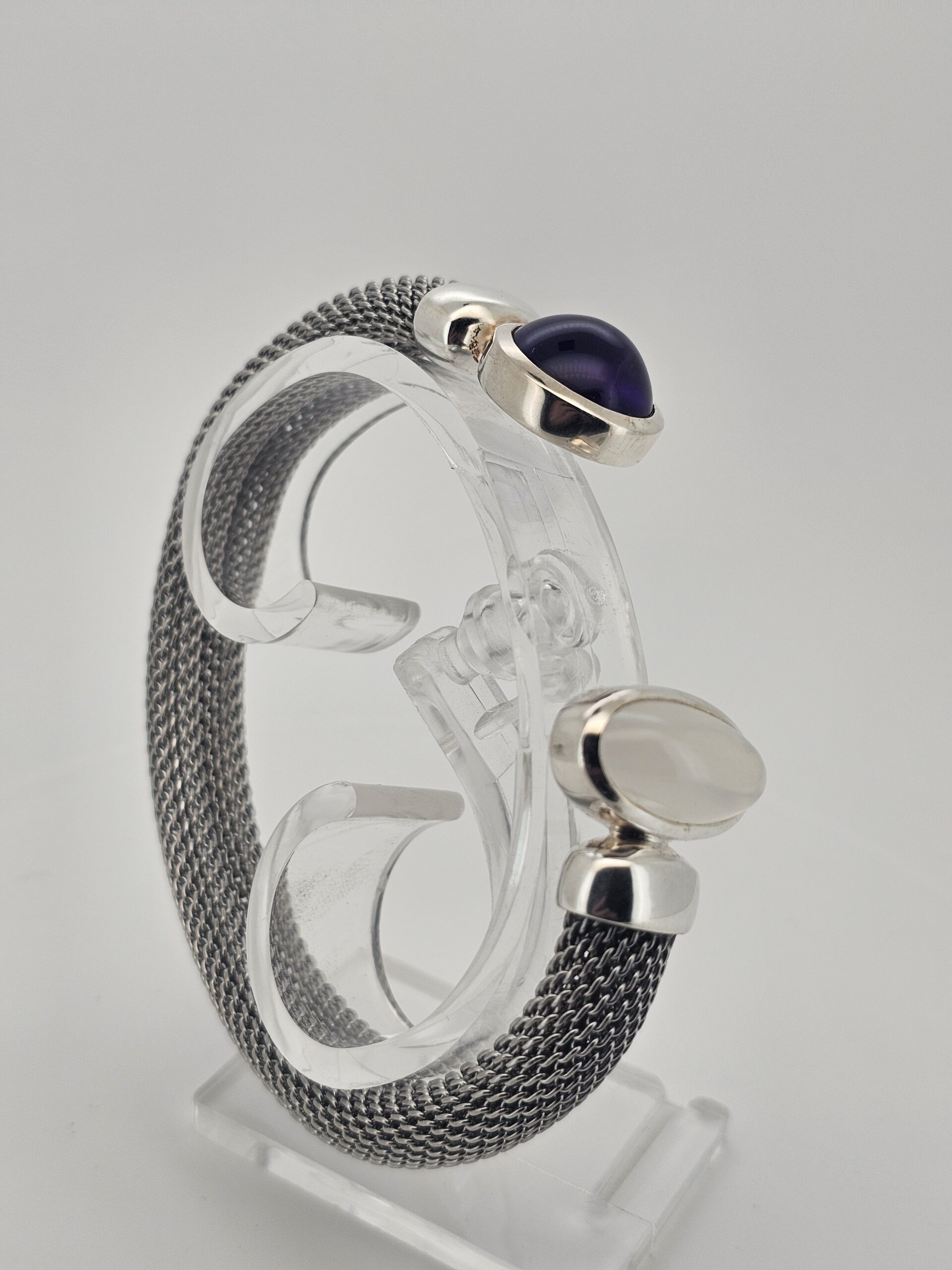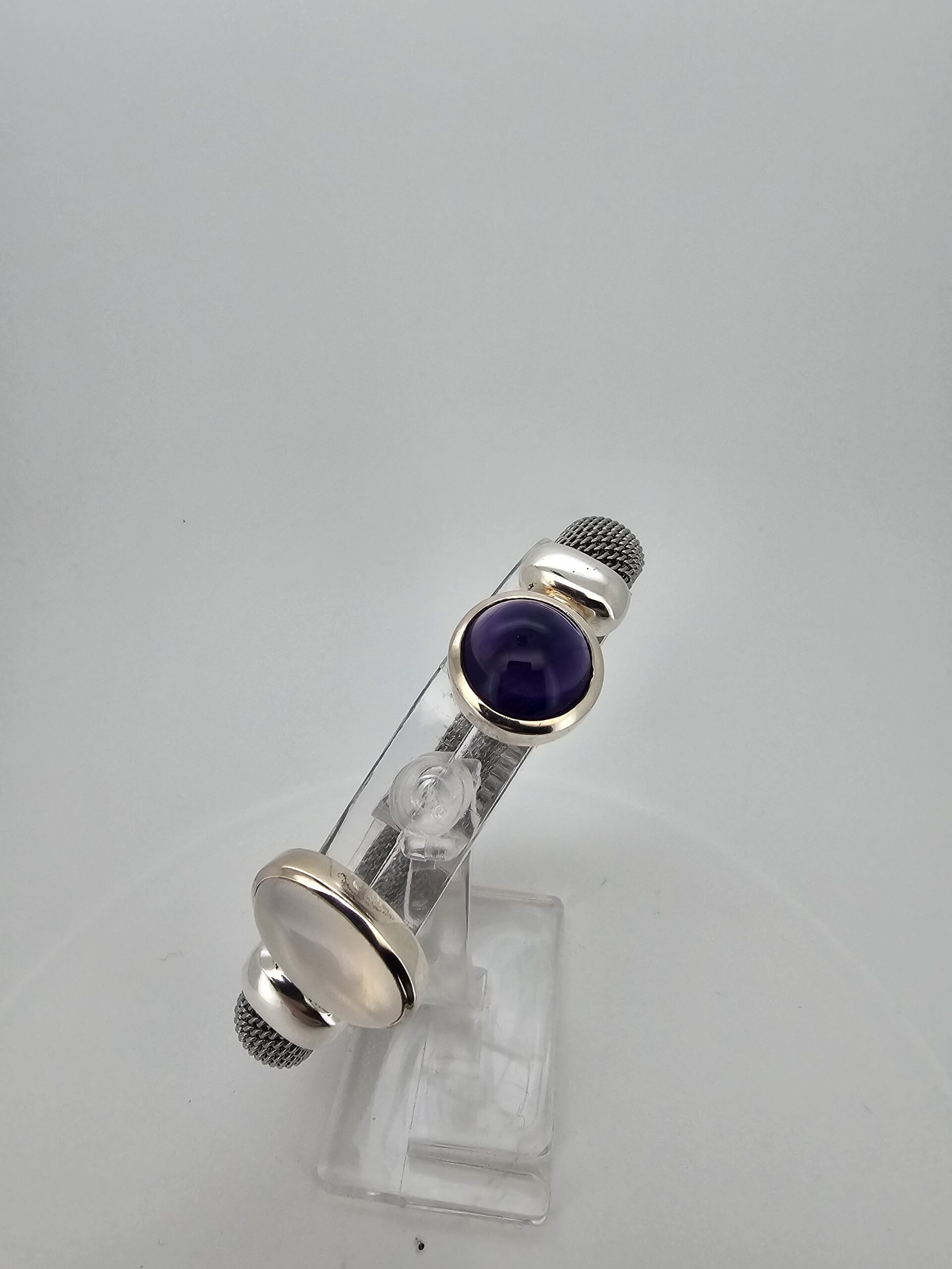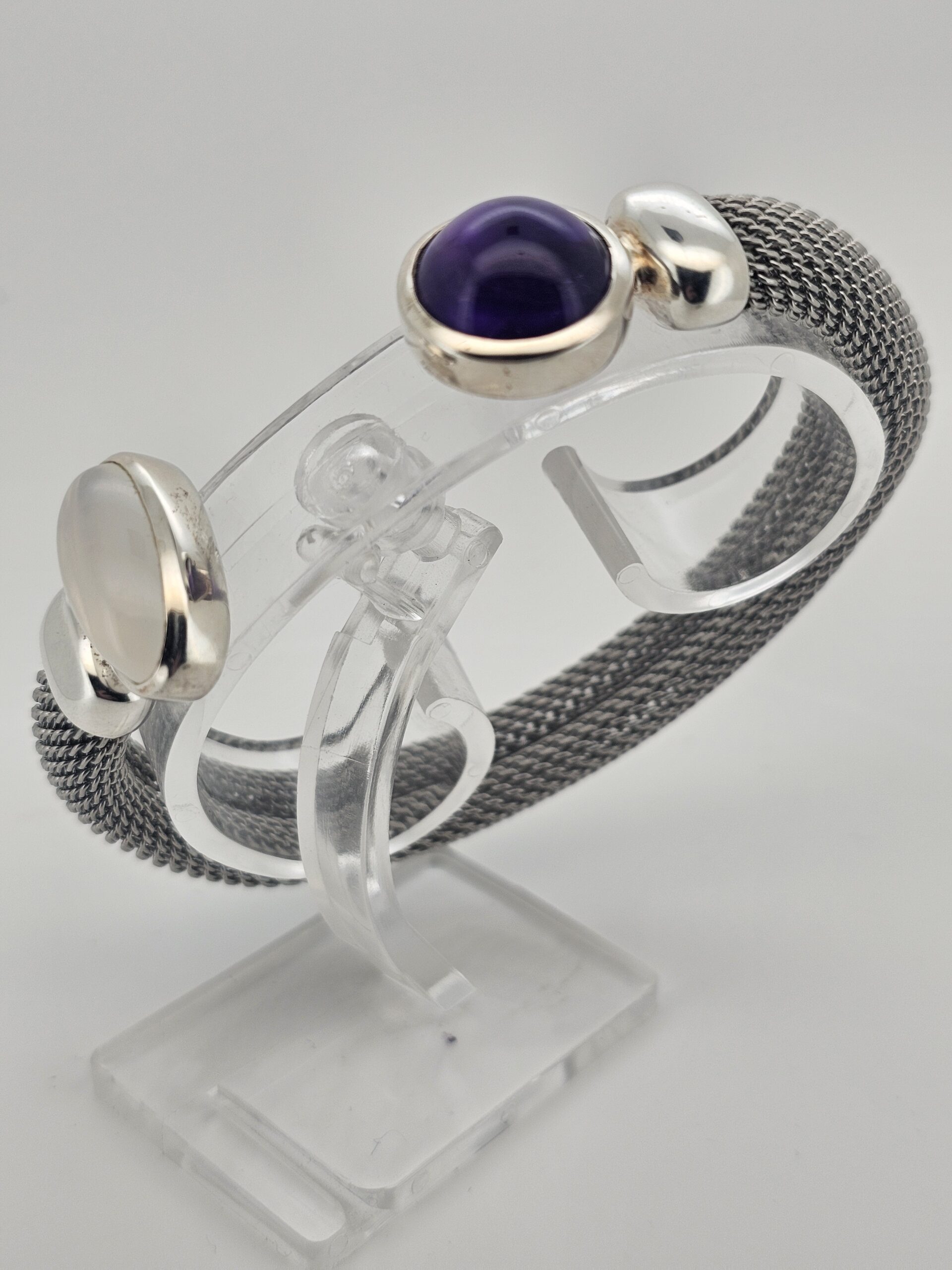 Exklusiver Armreif aus traditioneller Goldschmiedekunst aus Idar-Oberstein. Die Silberfassung mit Amethyst und Mondstein wird durch ein flexibles Edelstahlband ergänzt, das sich angenehm an das Handgelenk anpasst. Tragbar bei 19-20 cm Umfang, Armbandbreite 11 mm.