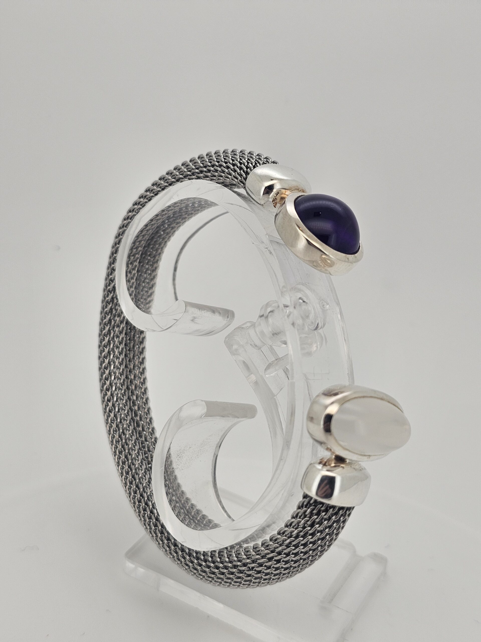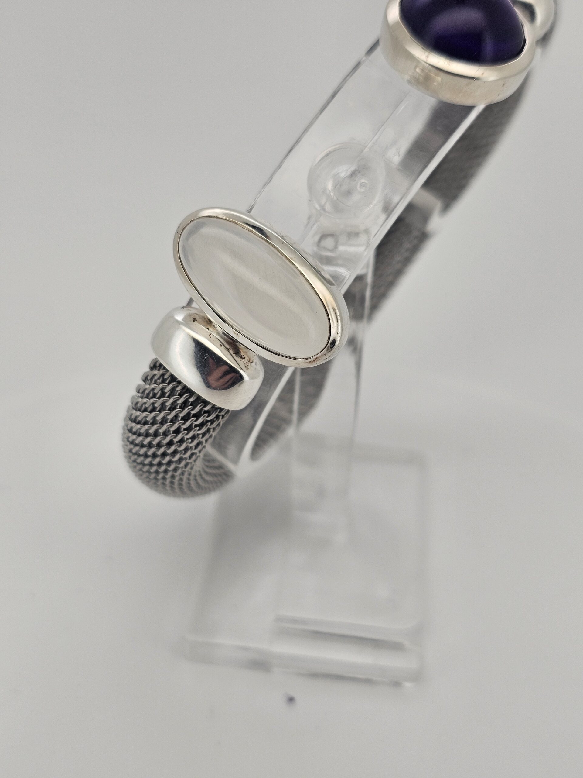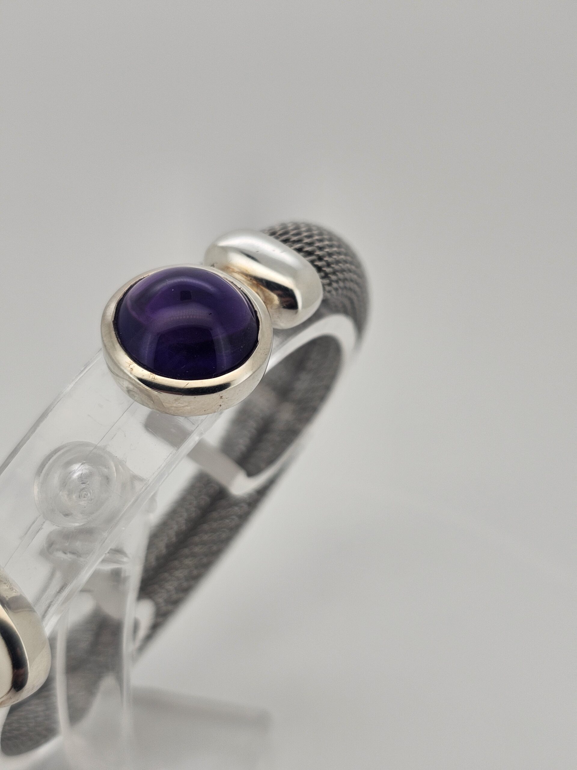 Exklusiver Armreif aus traditioneller Goldschmiedekunst aus Idar-Oberstein. Die Silberfassung mit Amethyst und Mondstein wird durch ein flexibles Edelstahlband ergänzt, das sich angenehm an das Handgelenk anpasst. Tragbar bei 19-20 cm Umfang, Armbandbreite 11 mm.
