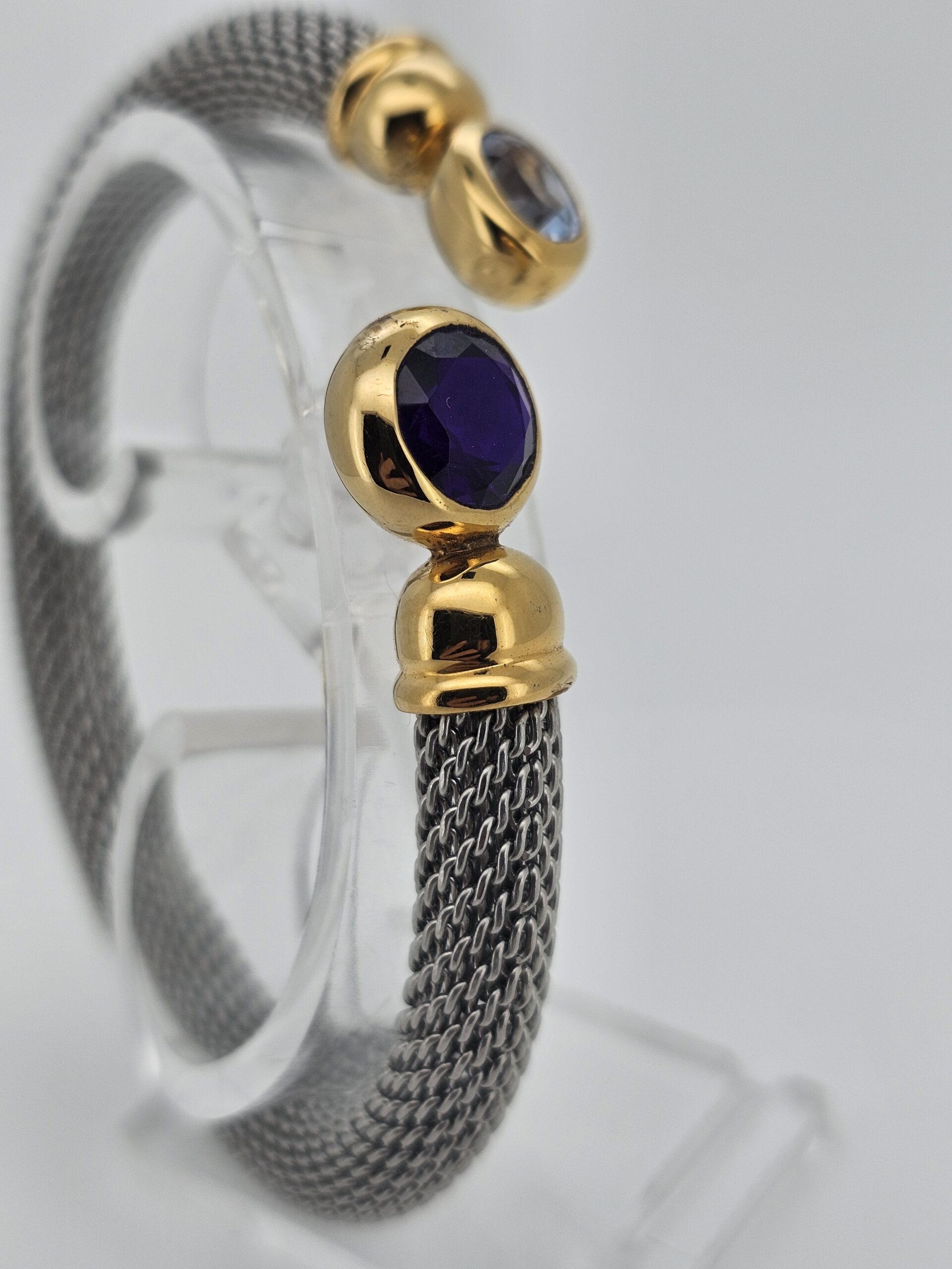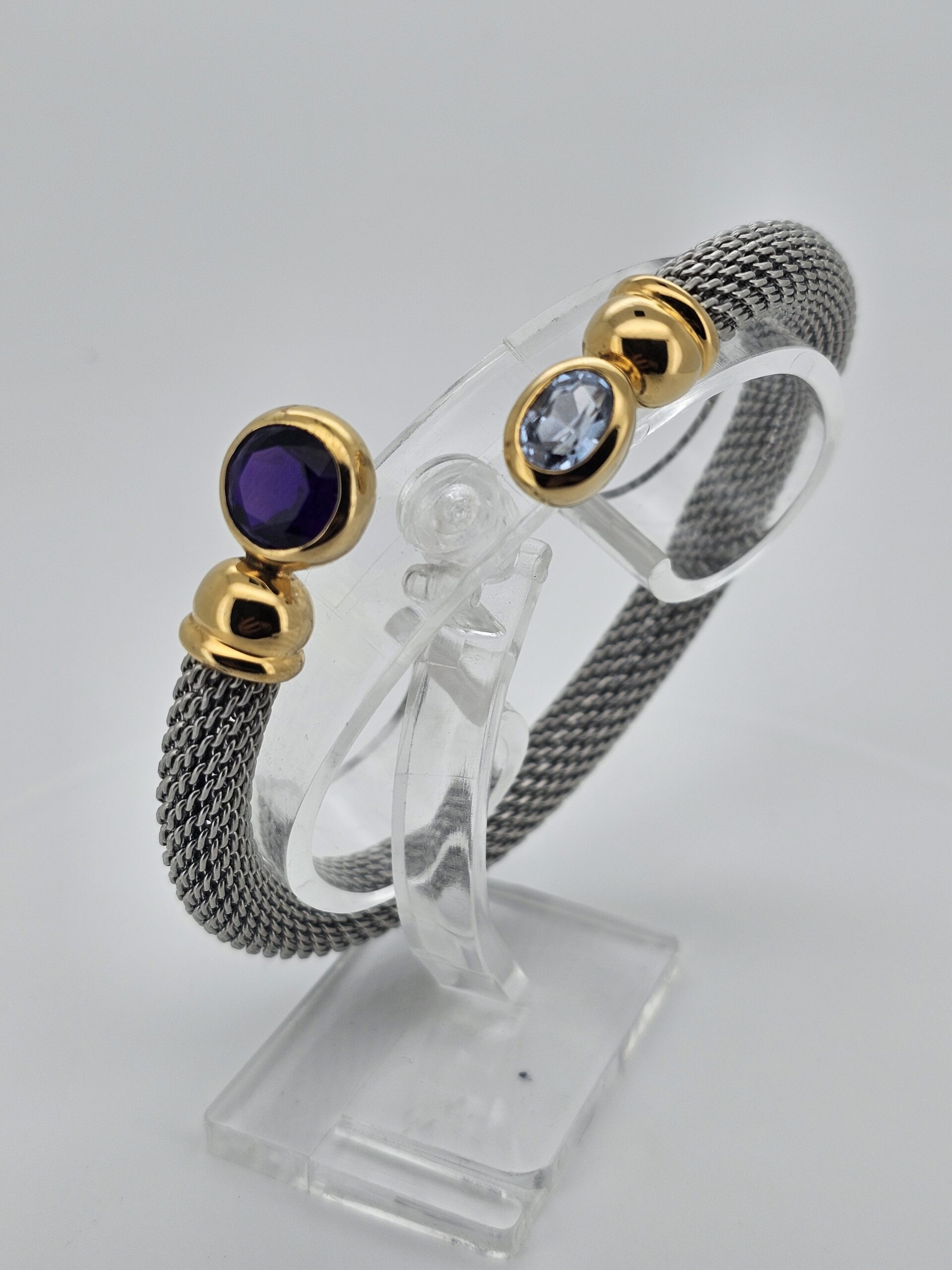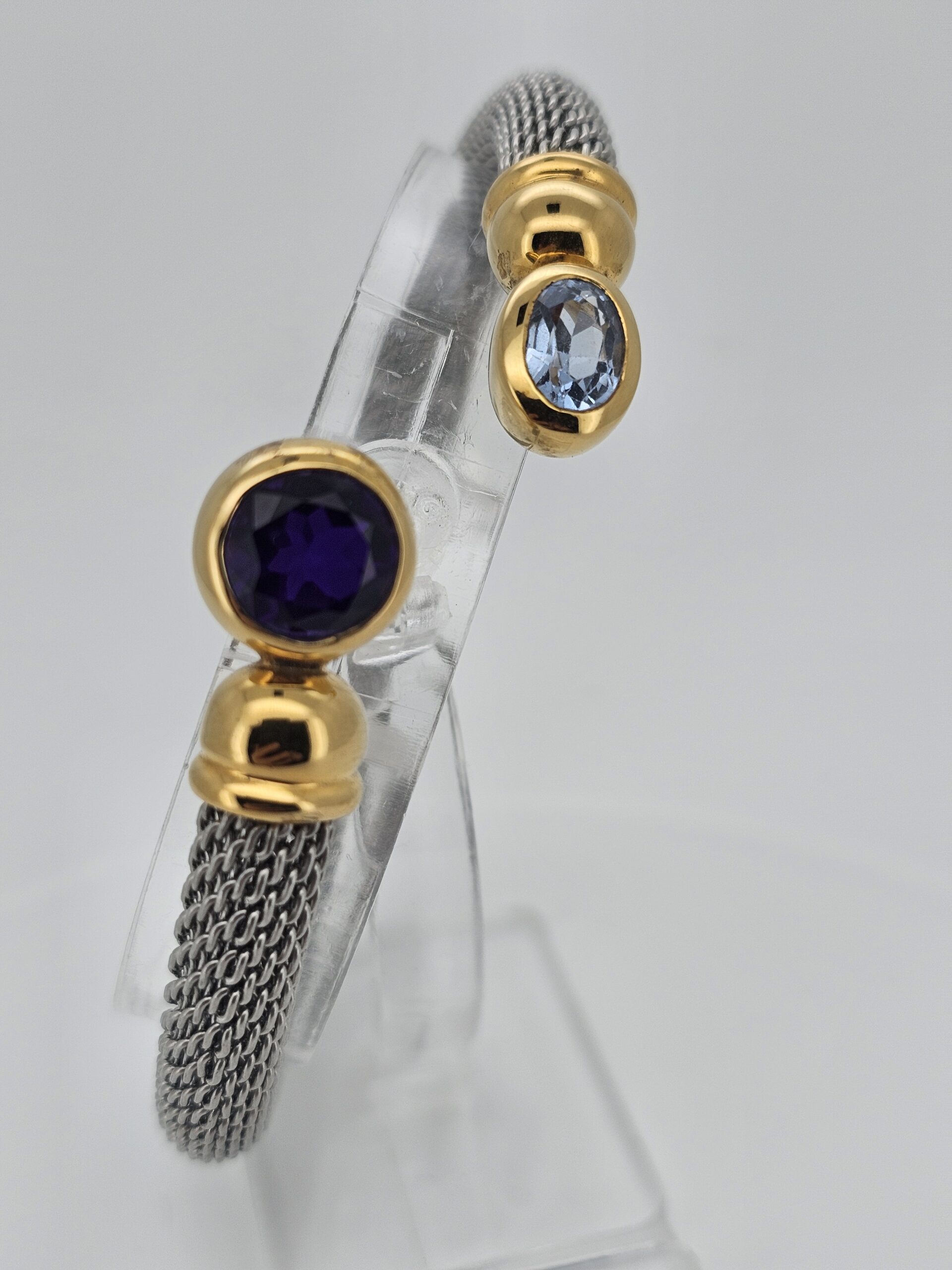 Exklusiver Armreif aus traditioneller Goldschmiedekunst aus Idar-Oberstein. Die vergoldete Silberfassung mit Aquamarin und Amethyst wird durch ein flexibles Edelstahlband ergänzt, das sich angenehm an das Handgelenk anpasst. Tragbar bei 18-20 cm Umfang, Armbandbreite 11 mm.