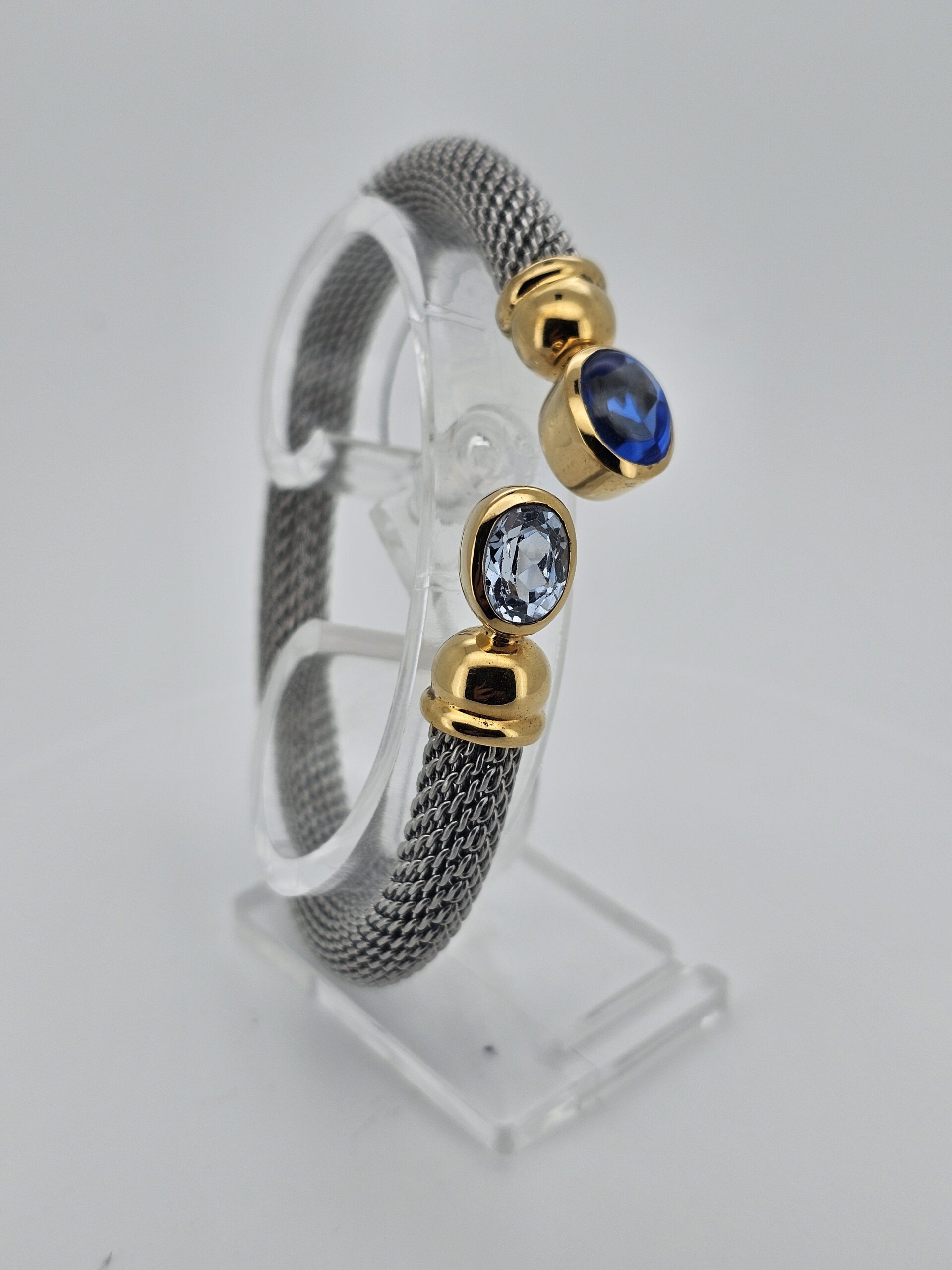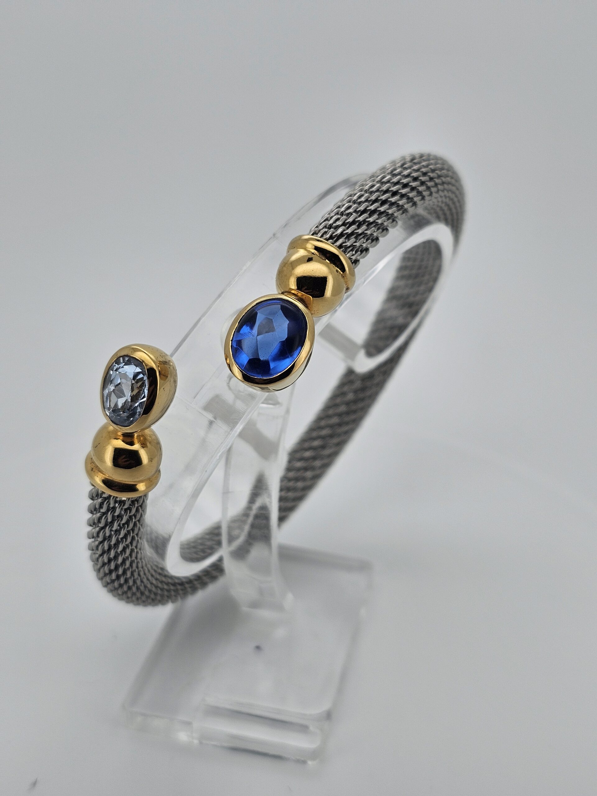 Exklusiver Armreif aus traditioneller Goldschmiedekunst aus Idar-Oberstein. Die vergoldete Silberfassung mit Aquamarin und synthetischem Saphir wird durch ein flexibles Edelstahlband ergänzt, das sich angenehm an das Handgelenk anpasst. Tragbar bei 18-20 cm Umfang, Armbandbreite 11 mm.
