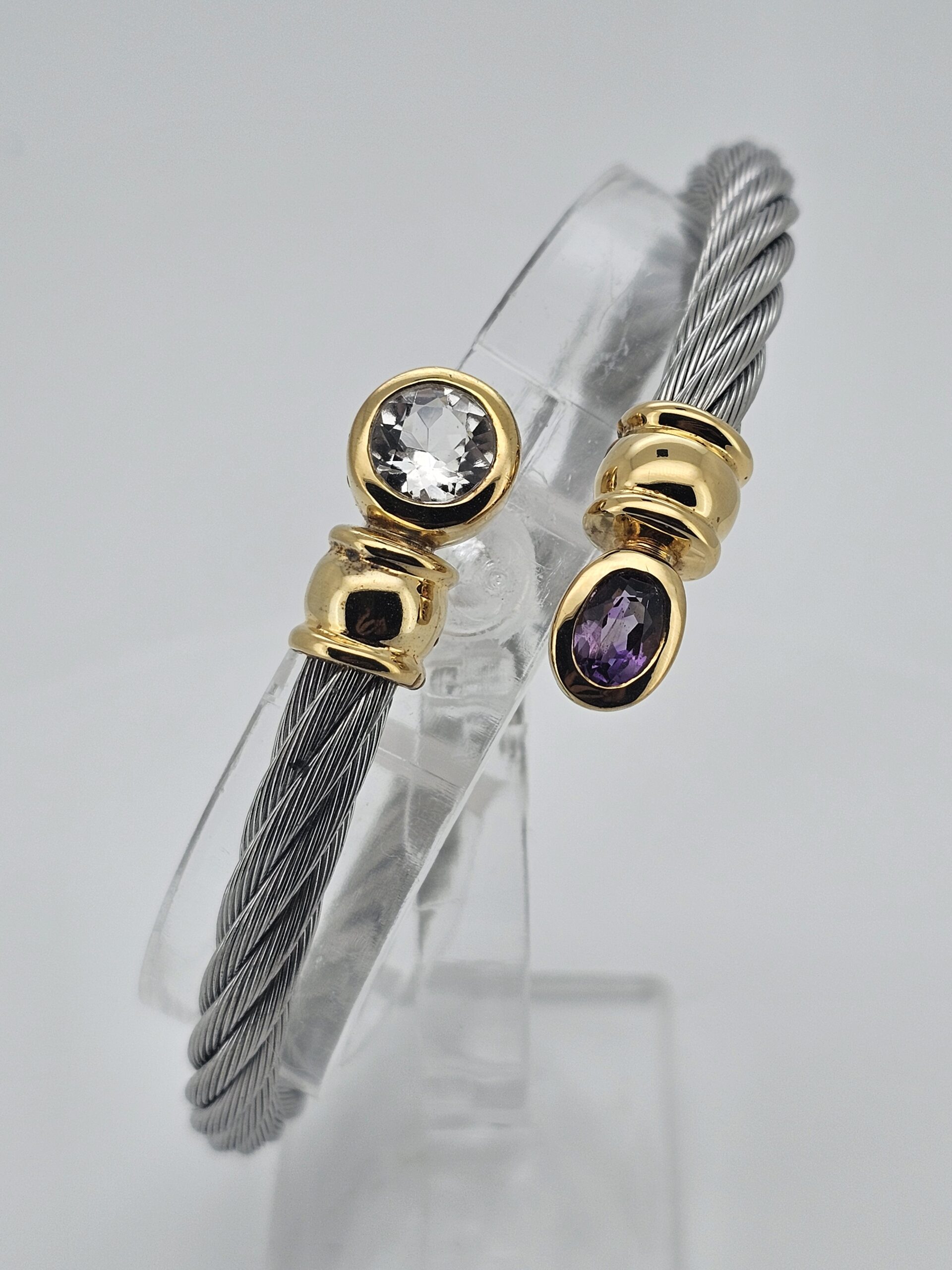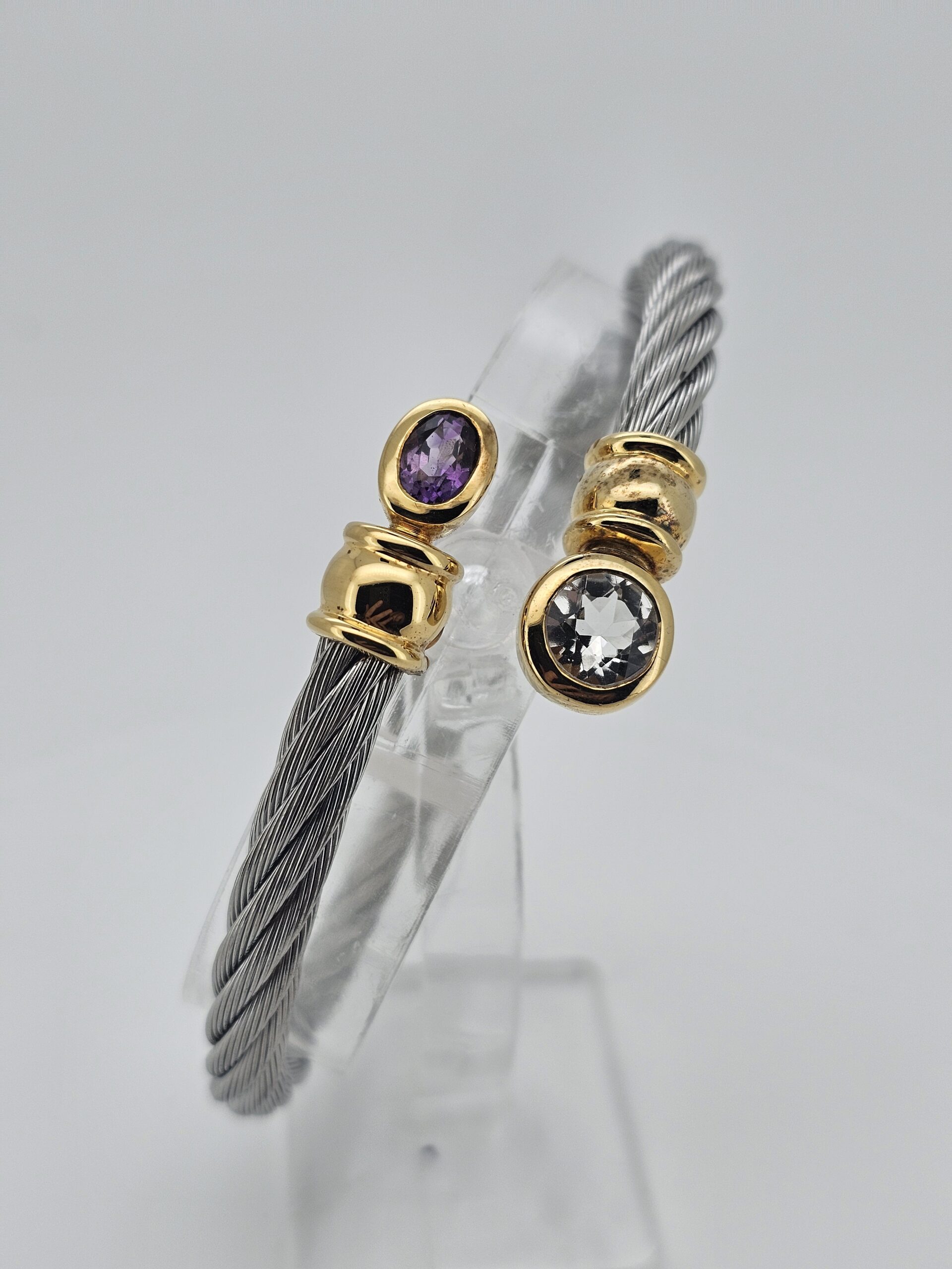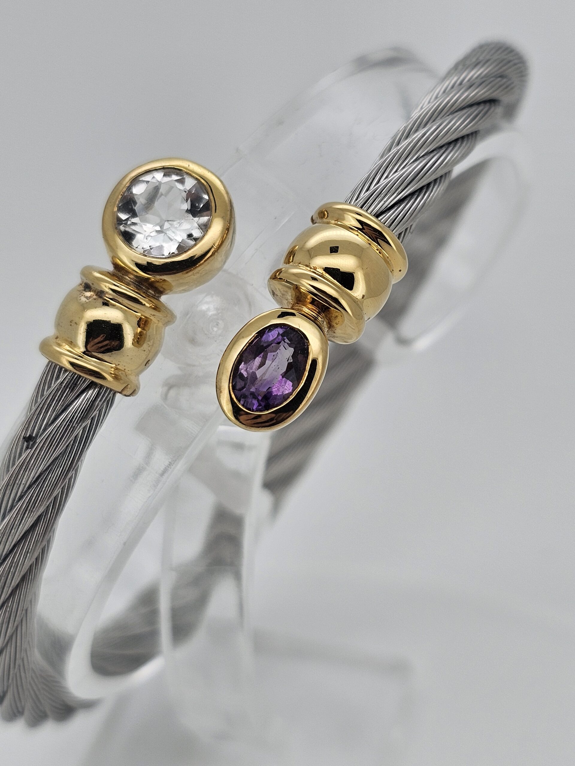 Exklusiver Armreif aus traditioneller Goldschmiedekunst aus Idar-Oberstein. Die vergoldete Silberfassung mit Amethyst und Bergkristall wird durch ein flexibles Edelstahlband ergänzt, das sich angenehm an das Handgelenk anpasst. Tragbar bei 20-22 cm Umfang, Armbandbreite 6 mm.